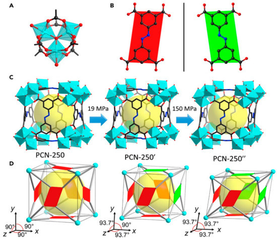 Shows the illustration of possible transformations that PCN-250 can undergo upon applying mechanical pressure such as the inclination of the unit cell and flipping of linkers, (A–D) Structure of (A) Fe3-µ3-oxo cluster; (B) ABTC linkers with different configurations; (C) comparison of the crystal structures of PCN-250, PCN-2500, and PCN-25000; (D) scheme representation of the structural transformation including the inclination of unit cell and flipping of linkers. [101].