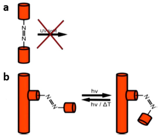 Photo-switchable azobenzene side groups. (a) Azo-linker as part of the backbone of the MOF, (b) azo-group covalently attached to the inner pore wall and extended into the pore [106].