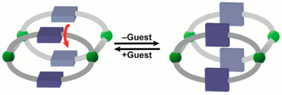 Kitagawa and his group [29] investigated the linker rotation of pyridinedicarboxylic acid linker (PDC) in {[Cd2(pzdc)2L(H2O)2] 5(HO) (CH3CH2OH)}n. The PDC linker, which bears ethylene glycol side chains, acts as a molecular gate with locking/unlocking interactions when this coordination polymer is triggered by guest inclusion, see Figure 1.