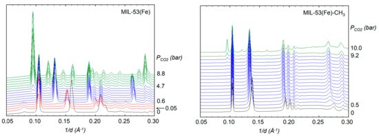 - Beurroies, I.; Boulhout, M.; Llewellyn, P.L.; Kuchta, B.; Férey, G.; Serre, C.; Denoyel, R. Using pressure to provoke the structural transition of metal-organic frameworks. Angew. Chem. Int. Ed. 2010, 49, 7526–7529. [Google Scholar] [CrossRef]