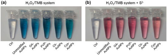 The surface passivation of AuNPs to inhibit the peroxidase-like activity by either sulfide (S2−) or iodine ions (I−) has been ascribed to the Au–S and Au–I bond-induced blocking of active sites, respectively [7,8]. In addition, S2− can react only with Au(I) and not with Au(III) to form Au2S in aqueous solution or at room temperature [17]. Accordingly, we hypothesized that Au(I) on the surface of AuNPs might be the active site of the peroxidase-like activity. Next, the inhibition of the peroxidase-like activity for different surface-capped AuNPs was examined by addition of S2−. As shown in Figure 2a, the five kinds of AuNPs could catalyze hydrogen peroxide (H2O2) to oxidize the substrate of 3,3′,5,5′-tetramethylbenzidine (TMB), resulting in the appearance of the blue color. The control experiment without AuNPs was not observed any color change. This indicated that the five kinds of AuNPs all possessed the intrinsic peroxidase-like activities. When pre-mixing these AuNPs with S2−, their peroxidase-like activities were significantly inhibited and thus the solutions retained the original red color of AuNPs (see Figure 2b). These results implied that AuNPs with various surface coatings should have the same active site of Au(I), and thus their peroxidase-like activities could all be inhibited by S2−. It should be noted that excess S2− can also lead to aggregation of AuNPs [18,19], and thus the active sites may be reduced by increasing the size of AuNPs. To avoid this problem, the added amount of S2− was carefully controlled to inhibit nearly 90% of the peroxidase-like activity (see Figure S2). It meant that the surface passivation of these AuNPs should not be at a saturation level of S2−. Following the previous work that I− could block active sites of AuNPs [8], our TEM images and UV-Vis spectra also verified that the inhibition of the peroxidase-like activity by S2− was due to blockage of the active sites on the surface rather than aggregation of AuNPs (see Figure S3).