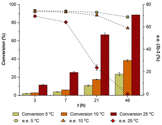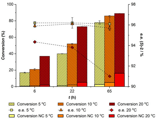 In general, temperature affects enzymatic stability and has a great effect on the reaction rate of enzyme-catalyzed reactions and their enantioselectivity. The influence of temperature on the enantioselectivity of enzymatic reactions can be explained by a simple theoretical model [30]. Depending on whether the reaction takes place below or above the so-called racemic temperature, a decrease in temperature will increase or decrease the enantioselectivity, respectively.