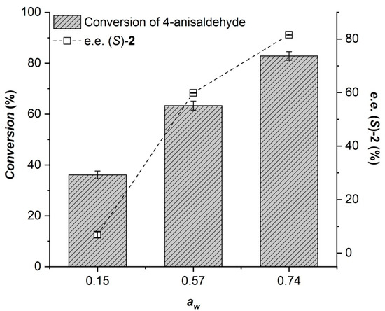 The effect of the three water activity values provided by the phosphate salts on the MeHNL-catalyzed hydrocyanation of 4-anisaldehyde was then evaluated (see Figure 3). Results at aw = 0.15 are difficult to interpret due to the above-mentioned catalytic effect of the salt. It seems, however, that the enzyme is hardly active at this low water activity. Comparison of the results at the two highest water activity values, where the background reaction is similarly low, shows that the activity and selectivity of MeHNL increased with increasing aw. Hence, to ensure a high e.e. of the resulting cyanohydrin, it is necessary to work at a high aw for the combination of MeHNL and CALA.