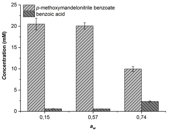In the case of HNLs it has been shown that when working at low water activities, the enzymes are insufficiently hydrated, resulting in activity and selectivity loss [12,13,14]. Lipases, on the other hand, can generally withstand lower water content [45], and some studies have shown that aw does not significantly influence the enantioselectivity of lipases [14,45,46,47]. Furthermore, water competes with the substrate alcohol (in this case, cyanohydrin) for the nucleophilic attack of the acyl-enzyme intermediate, leading to ester hydrolysis [48].