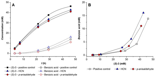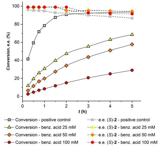 The influence of phenyl benzoate and its leaving group, phenol, on the MeHNL-catalyzed hydrocyanation of 4-methoxymandelonitrile was studied. Addition of either three equivalents of phenyl benzoate or phenol to the hydrocyanation reaction afforded (S)-4-methoxymandelonitrile with the same yield and enantiopurity as the control reaction (data not shown). To evaluate the effect of the side product benzoic acid on the hydrocyanation reaction, an experiment was performed with addition of different amounts of the acid to the reaction mixture. As shown in Figure 6, benzoic acid exerts a strong negative effect on the hydrocyanation rate of MeHNL. Thus, in order to achieve a cascade synthesis of 3 with high yield and selectivity, the CALA-catalyzed hydrolysis of phenyl benzoate and 3 should be minimized as much as possible. This observation is not surprising, since benzoic acid has previously been reported as a competitive inhibitor for other hydroxynitrile lyases [49,50,51]. Based on these results, the observed negative effect of benzoic acid on CALA is minor when compared to its effect on MeHNL.