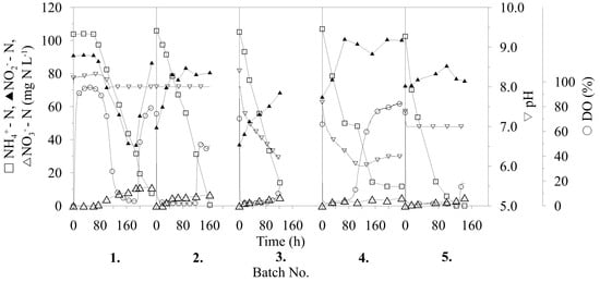 Figure 1 illustrates the process of each cycle of repeated biotransformation, and, as shown, low activity of the immobilized cells was observed during the first 60 h of the first biotransformation. This was most likely caused by the highly stressful aerobic conditions of the immobilization process to which the biomass was exposed for a short time beforehand. After this time, the oxygen started to decrease in the medium, as observed by a decrease in the dissolved oxygen (DO) content to 10%, presumably caused by production of nitrogen gas (a final compound of nitrogen conversion). The higher activity of the immobilized bacteria also presented simultaneous utilization of N–NH4+ and N–NO2−, probably caused by the suppression of the metabolic activity of one or more representatives of the immobilized AMX consortium also presented by formation of ions N–NO3−. Utilization of N–NO2− slowed around the middle of the first repeated batch and, instead of decreasing, it started to increase, according to the fermentation time. An increase of N–NO2− concentration and continuous utilization of N–NH4+ was more likely caused by the activity of AOB, which became dominant in the co-immobilized culture. As reported [17], AOB forms a thick layer around anammox cells which, after AOB domination, may eliminate the substrate (ammonia) access to AMX consortium (Equations (1,2)). During this first batch biotransformation, 52% of the total nitrogen was removed from compounds. The NRR, calculated from 0 to 30 h for each batch, was constant at 0 mg N (L h)−1 because of the long lag phase. After 256 h of the first biotransformation, the whole volume of the medium was separated through a sieve, subsequently fed with fresh medium and the next biotransformation was started.