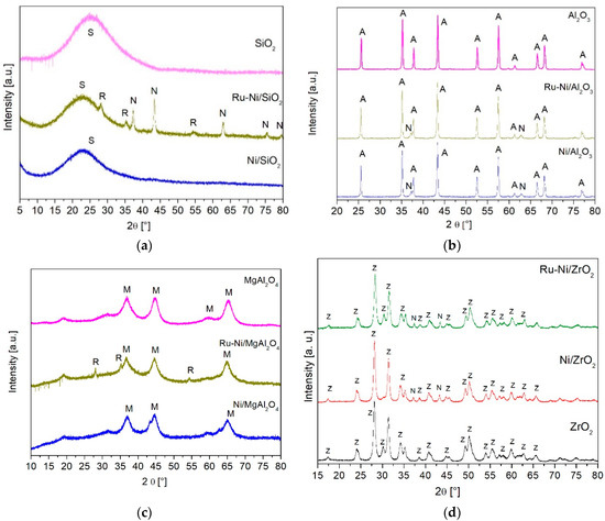 Results of the XRD measurements are presented in Figure 1a–d and Table 1. The letter, S, refers to the reflections assigned to SiO2 and N-NiO, R represents RuO2, A refers to Al2O3, M to MgAl2O4, and Z to ZrO2.