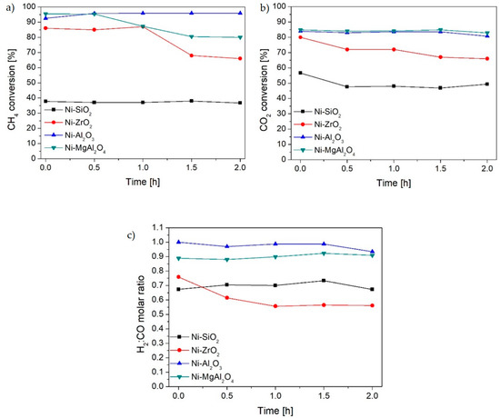 Results of the catalytic activity tests of nickel catalysts supported on SiO2, ZrO2, Al2O3, and MgAl2O4 are presented in Figure 2a–c. In the graphs, the results for supports are not included due to their negligible catalytic activity. The highest conversion for methane and carbon dioxide was obtained for Ni/Al2O3 and Ni/MgAl2O4 catalysts. The conversion level of CH4 for the Ni/Al2O3 after two hours of the process remained stable at around 95%. In the case of the catalyst deposited on the magnesium–alumina spinel support, the efficiency of the methane conversion after 30 min of the process started decreasing to a final level of 80%. The consumption of carbon dioxide for both catalysts was observed at a steady level of 85%. Significant differences were observed in the generation of hydrogen and carbon monoxide. The highest molar ratio of hydrogen to carbon(II) oxide was close to what was also observed for the catalysts, Ni/Al2O3 and Ni/MgAl2O4. Throughout the catalytic process, the nH2/nCO ratio for Ni/Al2O3 ranged from 0.95 to 1.0, whereas for Ni/MgAl2O4, it was constant at 0.9.