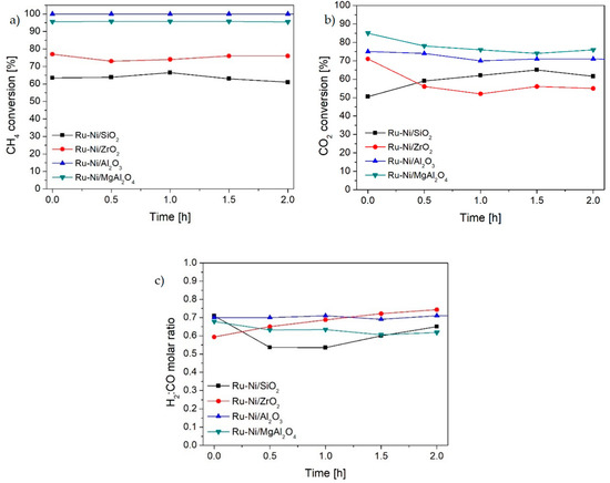 In Figure 3a–c, the results of tests on the activity of ruthenium–nickel catalysts are presented. The highest activity was observed for the Ru-Ni/Al2O3 catalyst. In comparison to Ni/Al2O3, an increase in activity due to the deposition of small ruthenium particles was observed. The conversion of methane remained stable—100% during the entire process—while the conversion of carbon dioxide ranged from 90% at the beginning to 71% after two hours. The molar ratios of hydrogen to carbon monoxide were lower in comparison to the catalysts containing only nickel particles. At the beginning of the process, it was 0.75 and it decreased during the process to 0.6. In the case of the Ru-Ni/MgAl2O4 catalyst, the complete conversion of methane was also observed. The conversion of carbon(IV) oxide ranged from 85% to 75% at the beginning and after 2 h of the process, respectively. The molar ratio of hydrogen/carbon monoxide was also slightly reduced from 0.67 to 0.61. The results obtained for the generation of CO and H2 are similar to the results obtained for Ni/MgAl2O4; however, the molar ratio of H2:CO was lower. The lack of catalytic activity enhancement is probably assigned to the deposition of large RuO2 particles. The lowest catalytic activity among the tested catalysts was observed for the Ru-Ni/SiO2 catalyst. The deposition of small ruthenium(IV) oxide particles on the silica surface resulted in an increase in the catalytic activity compared to Ni-SiO2. The conversion of methane increased from 37% to 60% to 64%. The degree of conversion of carbon(IV) oxide, however, remained at a similar level, around 50%. The H2:CO molar ratio was noted to be in the range of 0.70 to 0.53.