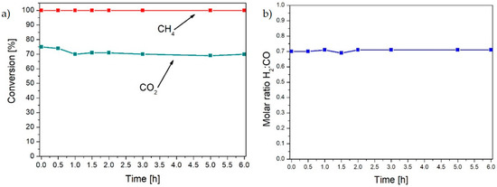 (a) Methane and carbon dioxide conversion and (b) hydrogen/carbon monoxide molar ratio for the 6 h test.