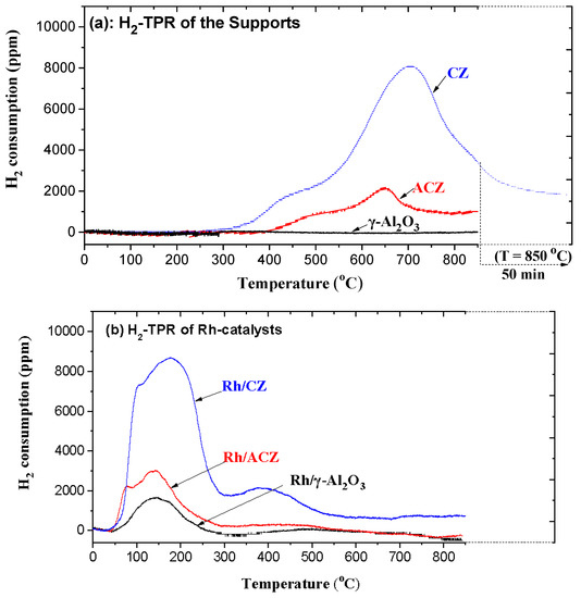 Figure 3 depicts the H2 consumption profiles of the supports (Figure 3a) and the Rh catalyst counterparts (Figure 3b) obtained by temperature programmed reduction with hydrogen (H2-TPR) experiments. Since our attention is focused on the amount of labile lattice oxygen in these materials, the discussion below provides this quantity in μmol O2 per gram of material, which corresponds to half of the amount of consumed H2. The oxygen storage capacities for both supports and catalysts assessed by H2-TPR (Figure 3) are included in Table 1. The values of 0, 101 and 557 μmol O2 g−1 for the γ-Al2O3, ACZ and CZ supports, respectively, reflect the nonreducible character of γ-Al2O3, and the Ce4+→Ce3+ reduction of ACZ and CZ supports giving rise in the latter cases to two broad overlapping peaks at ca. 450–500 °C and 650–700 °C (Figure 3a). This is a feature characteristic of ceria-containing samples [41,42]; the low-temperature (LT) peak is attributed to superficial reduction taking place at CZ surfaces, whilst the high-temperature (HT) one is assigned to reduction of bulk ceria [41].