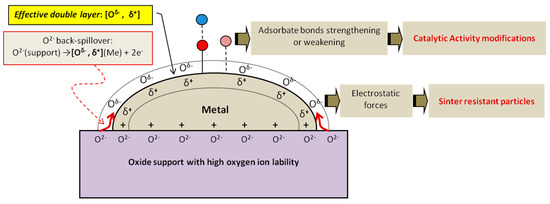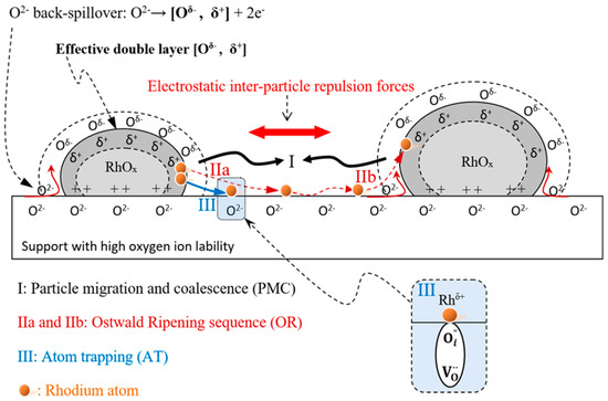 We recently developed a plausible model which explained the resistance to oxidative thermal sintering of Ir nanoparticles dispersed on oxide supports with high oxygen ion lability [8,27,28]. This involved the key role of the effective double layer [Oδ−, δ+] account of metal–support interactions [3,9,10,46], whereby thermally driven O2− back-spillover from supports with substantial labile oxygen onto catalyst nanoparticles affects not only their intrinsic surface activity [3,4,5,6,7,8,9,10,46], but also their sintering behavior (Figure 7), as we demonstrated for the first time in References [8,27,28]. We argued that the [Oδ−, δ+] double layer endows catalyst particles with a negative charge at their gas-exposed surfaces, leading to interparticle repulsion at short range, thus preventing particle–particle encounters followed by coalescence (i.e., PMC): The higher the lability of O2− in the support, the lower the vulnerability of the nanoparticles to sintering in an oxidative environment [8,27]. The model also implied simultaneous occurrence of atomic trapping as a contributing factor in the sinter-resistant mechanism: Labile support lattice oxygen creates surface oxygen vacancies (VÖ) that act as traps for very small (atomic) metal particles, thus inhibiting their diffusion and agglomeration [8]. At the same time, the Oδ− modified surface barrier present on large catalyst particles increases the activation energies for detachment and reattachment of metal entities whose transport would otherwise lead to continuous growth of large particles at the expense of smaller particles according to the OR model of sintering.