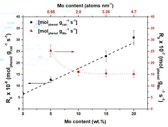 These results showed that the AT2 support was active and the initial reaction rate increased linearly with the Mo loading. Specifically, 5 wt.% Mo exhibited twice the activity of the support, while the activity for the 20 wt.% Mo catalyst was also five times higher. When the initial reaction rates were quantified by gram of supported Mo, a decrease was observed when the metal loading increased. However, at loadings higher than 10 wt.% Mo, activity remained constant. This may indicate that at this Mo loading, a monolayer was achieved. This result seems to be adequate to the system, since the Mo/Al2O3 monolayer coverage was near 10 wt.% Mo and 6.6 wt.% for Mo/TiO2 [38,39,40]. Selectivity data at 20% of phenol conversion are presented in Figure 2.