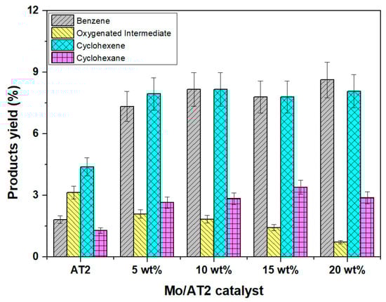 It was observed that the AT2 support alone mainly generated incomplete hydrogenation products, i.e., oxygenated intermediates (O–I, cyclohexanone, and cyclohexanol) and cyclohexene. Therefore, AT2 support presented a higher hydrogenation functionality than hydrogenolysis. However, it is possible that there were not enough sites to achieve cyclohexene hydrogenation. When Mo was added, even at low loadings, the product yields changed to an increase in benzene and cyclohexene production compared with the AT2 support. Also, as all Mo catalyst yields did not present significant changes, it is possible that the active sites’ nature was the same.