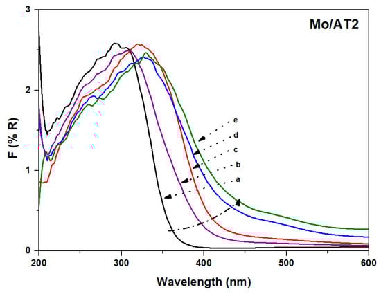 For the supported Mo catalysts, it could be considered that the band between 200 and 400 nm included the signals of Mo and titania [36]. The MLCT band for O2− → Mo6+ was located between 200 and 400 nm. In this band, Mo with tetrahedral coordination (MoTh) (MoO42−, Mo2O72−) were located in the 200–300 nm range. Besides, Mo with octahedral coordination (MoOh) from heptamolybdates and octamolybdates were included between 300 and 400 nm [41,42,43]. Even when a clear band assignation is complex, in a comparison between AT2 support with the different catalysts, it is possible to observe a shift in the reflectance bands to longer wavelengths with increments of the Mo loading. This could indicate a higher concentration of MoOh compared with MoTh at high Mo loadings.