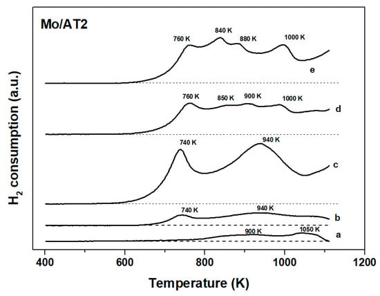TPR profiles for unpromoted Mo/AT2 catalysts calcined at 673 K at different Mo loadings. (a) AT2, (b) 5 wt.%, (c) 10 wt.%, (d) 15 wt.%, and (e) 20 wt.%.