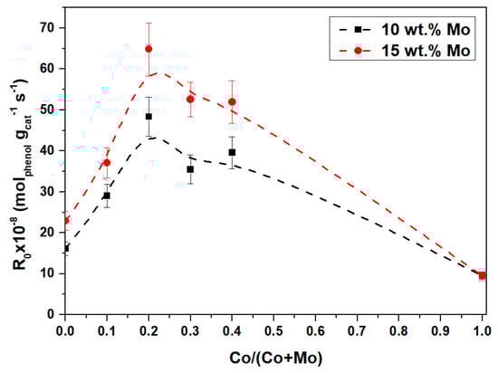 Initial reaction rates of HDO of phenol at different Co/(Co + Mo) ratios in the promoted CoMo/AT2 catalyst (■) at 10 wt.% Mo and (●) 15 wt.% Mo.