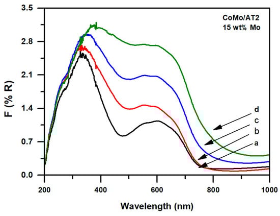It is possible to observe a shoulder centered at 260 nm corresponding to the MLCT O2− → TiO4+ bands. Then, the Co transition bands were in a wide signal between 400 and 1000 nm. The first signal at 400 nm was attributed to the Co2+ species with octahedral coordination (CoOh) [56]. However, like the Mo results, this band was overlaid with the titania MLCT and the analysis was difficult. The wide signal involves a triplet centered at 500, 580, and 630 nm, corresponding to d–d transitions of the Co2+ species with tetrahedral coordination (CoTh) and strongly interacting with alumina (CoAl2O4) [57]. Finally, a band near 750 nm was assigned to Co3+ and Co2+ species with octahedral coordination in Co3O4 [57]. On this basis, CoTh species were more abundant than CoOh species since the respective were more intense. This was due to the absence of Mo and the low Co loading (2 wt.%) on the support. Co could be well dispersed on the support in small particles, which interacted strongly with the alumina present in the support. Nonetheless, as titania was highly dispersed in the alumina matrix [58], it could avoid the migration of Co into the support. This could promote the formation of CoOh, which is a Co9S8 precursor. The promoted supported catalysts’ DR spectra are presented in Figure 8, showing two main bands, one located at 200–400 nm, and the other at 500 – 800 nm.