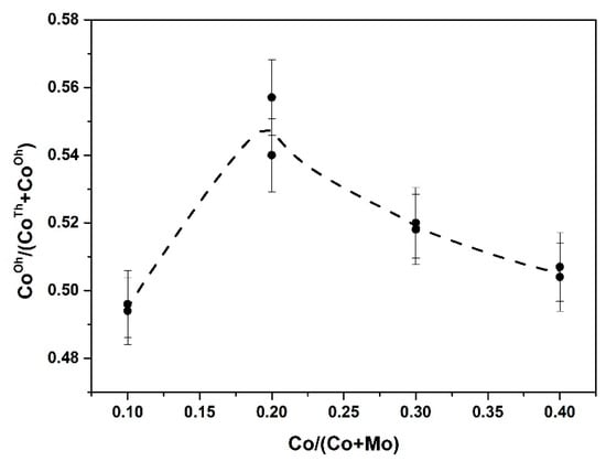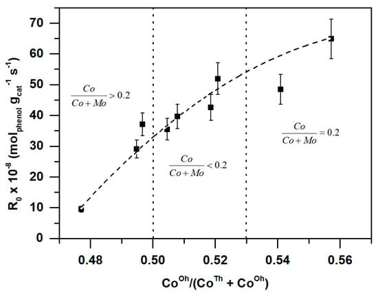 This correlation showed that as CoOh was increased, the initial reaction rate also increased. This is due to the proper promotion of Mo with CoOh to form the CoMoS phase. At low Co loadings, more CoTh species were present on the support and their sulfidation was less than the CoOh species, as has been reported before [34,64]. At the optimum Co/(Co + Mo) ratio, the amount of CoOh promoted the proper formation of the CoMoS phase and a fraction of Co could be CoTh. When Co was in excess, a fraction of it promoted the CoMoS phase, but also a fraction interacted strongly with Mo, giving place to CoMoO4. However, the Co3O4 phase was also be present and could be transformed into Co9S8.