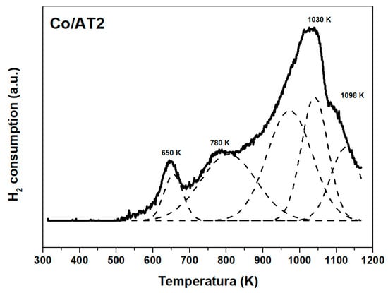 In Figure 11, the Co/AT2 calcined catalyst’s TPR profile is presented. It is possible to observe four signals centered at 650, 780, 1030, and 1098 K.