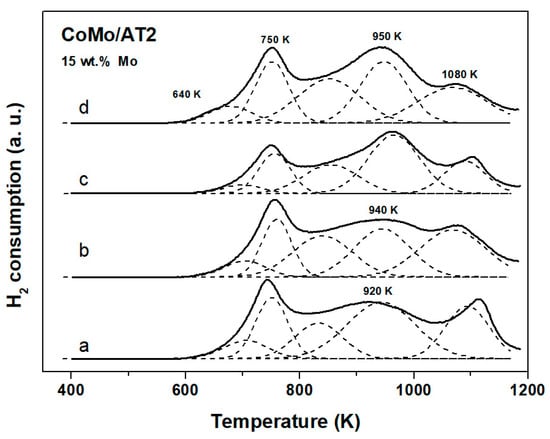 The CoMo/AT2 catalyst’s TPR profiles are presented in Figure 12. In general, all TPR profiles were similar to each other and showed three main peaks at 750, 950, and 1080 K.