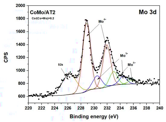 The Mo3d spectra displayed a doublet for the two spin orbit components, 3d5/2 and 3d3/2, located at 228.76 and 231.8 eV, respectively. Additionally, the S2s core levels’ band was detected at 226.3 eV. The XPS for the Mo3d5/2 decomposition showed peaks attributed to Mo in sulfide (Mo4+), oxysulfide (Mo5+), and oxidic (Mo6+) species. These peaks were located at 228.79 eV, 230.4 eV, and 232.80 eV, respectively [38,69,70].