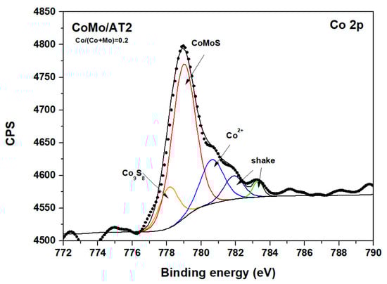XPS deconvolution of Co 2p core level for sulfided 15 wt.% Mo CoMo/AT2 catalysts at the Co/(Co + Mo) = 0.2 ratio.