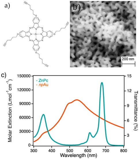 Structure of (a) the photosensitizer zinc phthalocyanine 3 used in this study, (b) porous structure of npAu and (c) corresponding optical spectra for zinc (II) phthalocyanine (ZnPc) (cyan) and transmission spectrum of a nanoporous gold foil with a thickness of 100 nm (orange) prepared as described in [20].