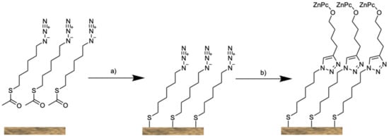 The functionalization of the npAu was achieved using a two-step synthetic approach. The npAu material was functionalized in a first step with a SAM consisting of an azide bearing thiolate as linker molecule. The functionalization can be achieved either with the free thiol or the corresponding acetyl protected thiol, which was used in this study [29]. Then the photoactive compound ZnPc 3 was subsequently linked to the functionalized npAu via the azide-alkyne Huisgen cycloaddition, often referred to as click reaction (Figure 2).