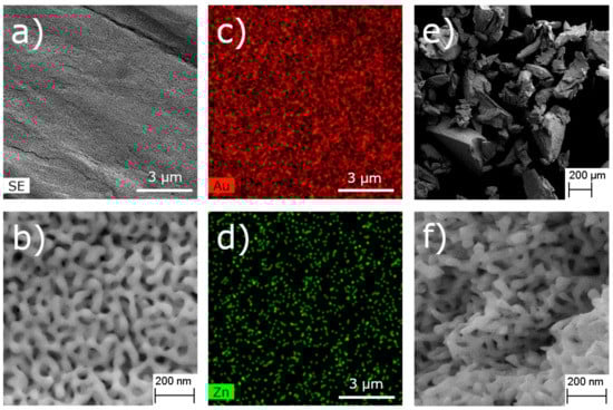 Structure of the npAu disk and powder after the two-step functionalization with the azide 1 without spacer and the photosensitizer ZnPc 3 (a) SEM image of the surface used for energy-dispersive X-ray (EDX) measurement, (b) SEM image of the porous structure with a magnification of 100,000, (c) EDX mapping for the element Au and (d) EDX mapping for the element Zn and SEM images of the structure of npAu powder with a magnification of (e) 10,000 and (f) 100,000.