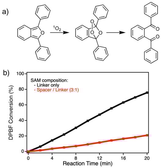 (a) Reaction scheme for the photooxidation of 1,3-diphenylisobenzofuran (DPBF) by 1O2 via an endoperoxide to 1,2-dibenzoylbenzene; (b) Photocatalytic DPBF conversion comparing the systems with either a 3:1 ratio of linker azidothioate 1: spacer 1-octanethiol (red) and the pure linker hybrid (black).
