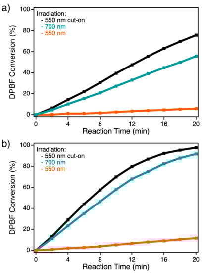 Photooxidation of DPBF at different irradiation wavelengths irradiating only the ZnPc absorption using a 700 nm filter (cyan), only the npAu plasmon resonance using a 550 nm filter (orange) or both absorption sites simultaneously using a 550 nm cut-on filter (black) and (a) a ZnPc functionalized npAu disk or (b) a ZnPc functionalized npAu powder as hybrid photocatalyst.