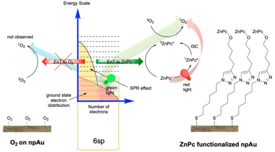 By simultaneous irradiation of both absorption sites in our hybrid system, the photocatalytic activity is significantly higher as compared to the irradiation of only the photosensitizer or only the npAu. It is expected that irradiation of the plasmon resonance of npAu induces an energy transfer (EnT) to the linked photosensitizer, which is then the photocatalytic active site for 1O2 formation (Figure 6, green pathway) [49,50]. Similar energy transfers were found in AuNP systems using time resolved spectroscopy techniques and in npAu to nearby located Rhodamine 6G fluorophores [41,42,51]. Electron transfer can be ruled out in our present system as the calculated distance between the surface of npAu and ZnPc is 1.9 nm which is too far for electron transfer with a limit of around 1 nm [52].