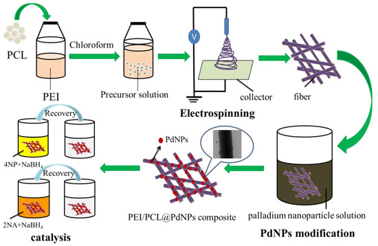 Polyethylenimine (PEI, M.W. 600.99%) was purchased from Shanghai Aladdin Biochemical Technology Co., Ltd. (Shanghai, China), and the same with Palladium chloride (PdCl2, Pd 59–60%). Polycaprolactone (PCL, average Mn 80,000) was obtained from Sigma-Aldrich (Shanghai) Trading Co. Ltd. (China). Trichloromethane (CHCl3) was obtained from Jindong Tianzheng Co. Ltd. In addition, Sodium borohydride (NaBH4), 2-nitroaniline (2-NA) and 4-nitrophenol (4-NP) were obtained from Alfa Aesar (Beijing, China). All chemicals were not further purified. A Milli-Q Millipore Filtration System (Millipore Co., Bedford, MA, USA) was used to prepare ultrapure water.