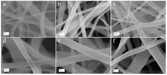 SEM images of AuNPs coated PEI/PCL electrospun fibers with different weight ratios ((w/w) (a), 10:90; (b), 15:85; (c), 20:80; (d), 25:75; (e), 30:70; (f), 35:65).