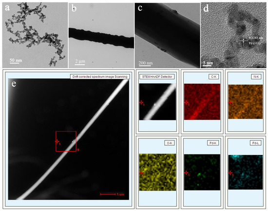 In order to further observe the structure of as-prepared PEI/PCL@PdNPs composite, the transmission electron microscopy (TEM) morphologies of the obtained fibers were examined, as shown in Figure 3. It was obvious that the surface of PEI/PCL fiber (sample 6, w/w, 35:65) was uneven, as shown in Figure 3b. The rugged structure increased the specific surface area helpful to next chemical modification of the fibers. It could be seen in Figure 3c that the PdNPs modified on the surface of PEI/PCL fibers showed the mean size range of 5–10 nm. As shown in Figure 3d, the interplanar spacing of the palladium nanoparticles was 0.2243 nm, which well matched the (111) crystal plane of Pd [35]. Furthermore, the Pd element mapping shown in Figure 3e was good evidence of the presence and distribution of palladium nanoparticles on the surface of the prepared PEI/PCL fibers. It was reasonably speculated that hydrophilic PdNPs were successfully anchored on the surface of PEI/PCL composite fibers via weak intermolecular interactions, then the composites could be expected good catalytic activity in next catalytic process [36,37].
