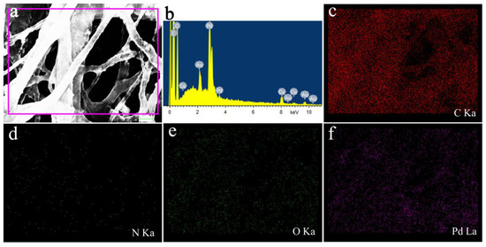 In addition, the morphology of PEI/PCL@PdNPs was characterized by scanning electron microscope (SEM), as shown in Figure 4. Figure 4a depicted the SEM structure of PEI/PCL@PdNPs, and it was apparent that deposits were present on the surface of the PEI/PCL fibers. The energy dispersive spectroscopy (EDS) image of the obtained PEI/PCL@PdNPs shown in Figure 4b–d clearly showed the presence of carbon, oxygen, nitrogen, and palladium elements. Due to the shielding effect, only a part of the nitrogen element in the PEI could be displayed, as shown in Figure 4d. The presence of small amounts of gold and copper was due to the coated-gold treatment and copper substrate used during the measurement. From EDS data, the detailed atomic percentages were found to be C = 75.37%, O = 12.61%, N = 7.88%, and Pd = 1.23%. The above results indicated that the palladium nanoparticles were successfully modified on the surface of the PEI/PCL fibers.
