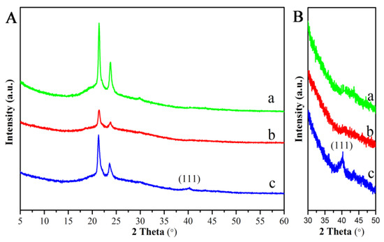 X-ray diffraction spectroscopy (XRD) pattern (A) with zoom-in region (B) of PEI/PCL fibers with the weight ratios of 10:90 (a) and 35:65 (b) and PEI/PCL@PdNPs composite (c).