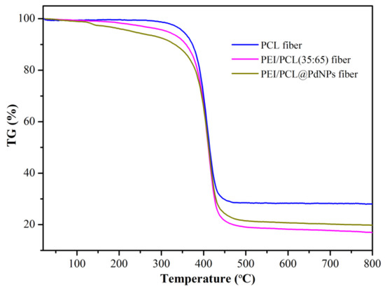 To investigate the thermal stability of the prepared PEI/PCL@PdNPs composite, the thermogravimetric characterization of the obtained PCL fibers, PEI/PCL fibers, and PEI/PCL@PdNPs composite were measured under argon gas atmosphere, as shown in Figure 6. TG analysis of the three composite fiber materials showed that the weight loss was slower when the temperature was lower than 120 °C due to the volatilization of residual moisture in the samples [40]. In addition, when the temperature was higher than 500 °C, the quality of the three species of samples tended to be stable. Between 120 °C and 450 °C, the weight of above-mentioned three samples was firstly slow loss, and then the weight of these samples was sharply lost at 400 °C, which was due to the thermal decomposition of various chemical groups and alkyl chains contained in these samples at high temperature [41]. The tempertature points with mass loss 5 wt.% showed the values of 353, 311, and 236 °C for PCL fibers, PEI/PCL fibers, and PEI/PCL@PdNPs composite fibers, respectively, indicating that the addition of the PEI component and PdNPs reduced the thermal stability of the composite fibers. The above significant difference in the thermal stability could reasonably be attributed to the inclusion of palladium nanoparticles on the surface of the composite fibers.