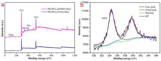 Survey X-ray photoelectron spectroscopy (XPS) spectra of the obtained PEI/PCL fiber and PEI/PCL@PdNPs (a) and deconvolutions of XPS peaks of the Pd3d region (b).
