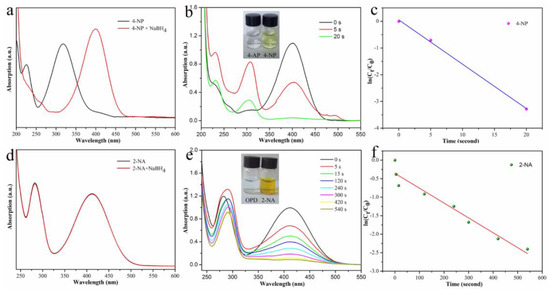 UV absorption curves of 4-NP and 2-NA before and after adding NaBH4 aqueous solution (a,d); catalytic reduction of 4-NP and 2-NA with PEI/PCL@PdNPs composite (PEI:PCL, w/w, 35:65) and photos of 4-NP and 2-NA solution after reduction (b,e); linear relationship of the reduction process (c,f).