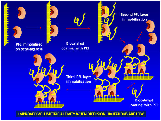 To reach this goal, it is necessary to “activate” the immobilized enzyme molecules surface in a way that allows the immobilization of a new layer of enzymes. This may be achieved using polyethylenimine (PEI) [18,19,20,21] (Figure 1). This polymer is multicationic, has primary, secondary and tertiary amino groups and has been broadly used in biocatalysis design, in some instances to coimmobilize enzymes [22,23] or enzymes and cofactors [24,25,26]. The only problem (with the second and further enzyme layers) of this new strategy is that, after immobilizing the enzyme via ion exchange on PEI, the new coating with PEI of the previously ionically exchanged enzyme could produce some enzyme leaching from the support by competition among the PEI coating the previously immobilized enzyme layer, the immobilized enzyme molecules layer and the new doses of free PEI.