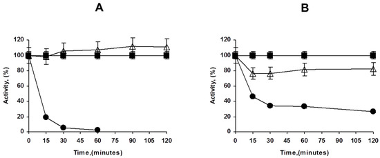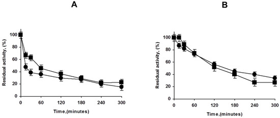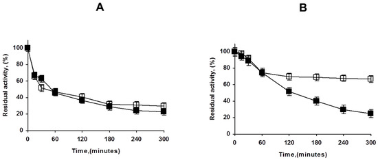 Effect of PEI coating of lowly (A) and highly (B) loaded PFL octyl biocatalysts. Inactivation carried out in 50 mM Tris at pH 7 and 75 °C. Other details are described in Methods section. Circles: unmodified preparations. Squares: PEI coated preparations.
