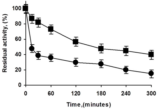 There are reports on the effect of enzyme loading and immobilization rate on the final immobilized enzyme stability [39,40]. To study if the use of overloaded PFL biocatalysts could have some effects on enzyme stability, both preparations were inactivated (Figure 3). The overloaded biocatalysts presented higher stability than the low loaded preparation, although part of this effect may be explained by an artifact caused by the diffusional limitations (the specific activity of the overloaded enzyme was 68% of that of the lowly loaded preparation), it looks that the stability of the overcrowded preparation was slightly higher under the inactivation conditions. That is, the use of overcrowded PFL preparations had even advantages in terms of enzyme stability.