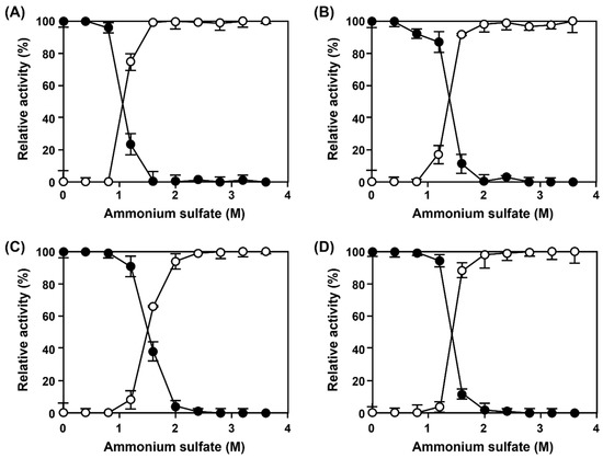 As ammonium sulfate (AS) has been previously selected as the precipitant for AMAO2 [23], AS was selected as the precipitant for CLEAs-MAPO and combi-CLEAs formation. As in the previous work, AMAO2 was completely precipitated at the concentrations of AS higher than 1.6 M, and fully recovered by the dilution of AS (Figure 1A). Due to the request of 2 M AS for full aggregation of APUO (Figure 1B), 2 M AS concentration was determined for simultaneous precipitation of AMAO2 and APUO. Through the optimization based on AMAO2 activity, the final condition for combi-CLEAs was determined as 1.25 mg/mL of each enzyme in 100 mM phosphate buffer (pH 8.0) containing 2 M AS and 40 mM glutaraldehyde (GA) for 12 h at 25 °C was determined. The relative residual tyramine-activity of the CLEAs based on the activities of the subjected enzymes (described as the yield of the CLEAs hereafter) was 71% (open circles in Figure 2), which was similar to the condition for CLEAs-AMAO2 (50 mM of GA and cross-linking for 17 h at pH 8.0 with 1 mg/mL of AMAO2) [23]. The optimum condition for APUO activity was same as that of AMAO2 (data not shown).