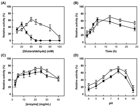 Optimization of cross-linking condition for cross-linked enzyme aggregates of the fused enzyme (CLEAs-MAPO) (closed circles) and combi-CLEAs (open circles). (A) Glutaraldehyde concentration; (B) cross-linking time; (C) protein concentration; (D) the CLEAs at each condition were recovered by centrifugation (12,000× g for 10 min), followed by washing and resuspension in 100 mM phosphate buffer (pH 7.0) for the assay. The activities of amine oxidases were measured according to the peroxidase-coupled assay [16] using tyramine as the substrate at the optimum condition of each enzyme.