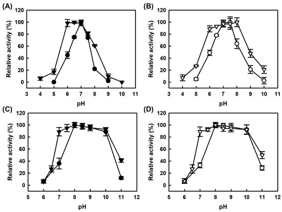 Effect of pH on activity of free and CLEAs enzymes. (A) Monoamine oxidase activity for free AMAO2 (▼) and MAPO (●) using tyramine as the substrate, (B) monoamine oxidase activity for combi-CLEAs (▽)and CLEAs-MAPO (○) using tyramine as the substrate, (C) putrescine oxidase activity for free APUO (▼) and MAPO (●) using putrescine as the substrate, (D) putrescine oxidase activity for combi-CLEAs (▽) and CLEAs-MAPO (○) using putrescine as the substrate. The activities of amine oxidases were measured according to the peroxidase-coupled assay [16]. Upon determining optimal temperatures of the enzymes, the reactions were carried out at 50 °C and a pH of 4.0–10.0.