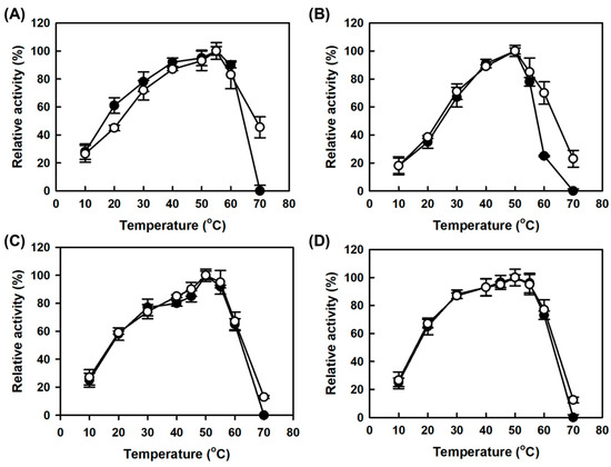 MAPO showed a lower optimum temperature for monoamine oxidase activity than AMAO2 by 5 °C (closed circles in Figure 4A,B for AMAO2 and MAPO, respectively), which was consistent with the previous work [19]. By contrast, the monoamine oxidase activities for both CLEAs enzymes were maximal at the same optimal temperature of the corresponding free enzymes (Figure 4). In addition, both CLEAs enzymes showed improved monoamine oxidase activities at a temperature higher than their optimal temperatures, suggesting that the CLEAs enzymes achieved thermostability without the decrease in optimal temperature. As seen in the pH profile, there was no significant difference in the temperature profiles for putrescine activity between the CLEAs enzyme and the corresponding free enzymes (Figure 4C,D).