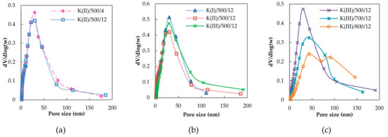 Pore size distribution of selected catalysts: (a) Effect of calcination time for samples K(II)/500/z, (b) effect of K amount for samples K(x)/500/12 and (c) effect of calcination temperature for samples K(III)/y/12.