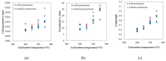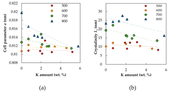 After careful inspection of the cell parameter changes, it was found out that Lc and a did not depend on the K amount for samples calcined at 500 and 600 °C, while for samples calcined at 700 and especially at 800 °C, the obvious dependence on potassium concentration could be observed (Figure 3a,b).